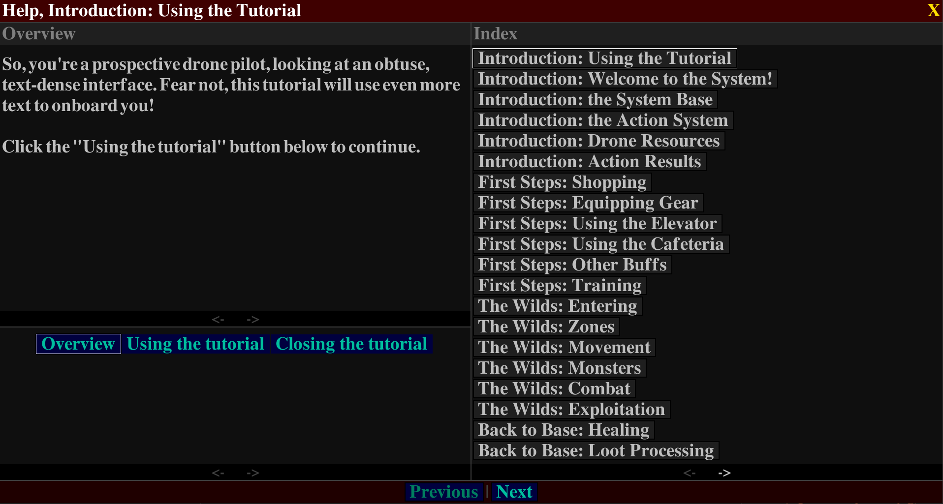 A magitech, post-apocalyptic, turn-based RPG. Assist your faction with exploration, resource gathering, construction, research, item fabrication, and monster extermination, while absorbing ambient mana and leveling up your System drone.
