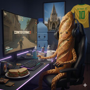 wygeneruj mi obrazek bagietki grającej w cs2 na komputerze ze stanowiskiem gamingowym